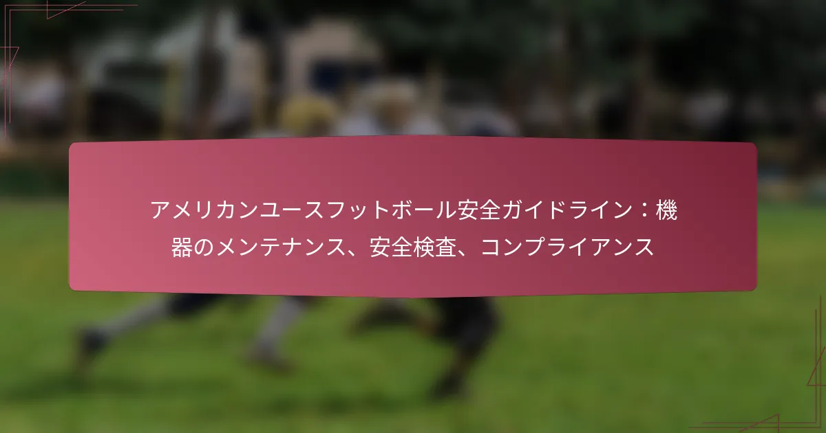 アメリカン・ユース・フットボール(AYF)は、安全と設備メンテナンスに焦点を当てた包括的なガイドラインを確立しています。これらのガイドラインには、ヘルメットやパッドの定期的な点検が含まれ、損傷がないことと安全基準を満たしていることを確認します。